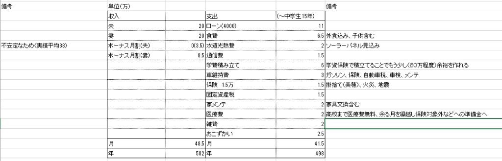 夫が約370万(内ボーナス45万)、私が約470万(内ボーナス95万)で2人合わせて840万ほどです。私は地方のためボーナスが安定していますが、夫は業績によるのでできれば家計の計算に含みたくない(不確定要素により左右されたくない)と考えています😢