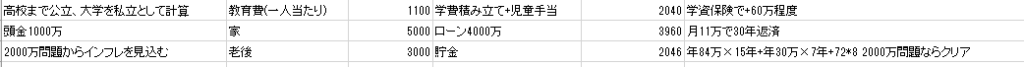 学費や2000万問題にどう対処していくかを計算する必要があります。学費ですが、高校まで公立、大学は私立として計算すると一人あたり1100万程度かかります。老後2000万問題もインフレによってさらに必要な額が増える可能性もあります。